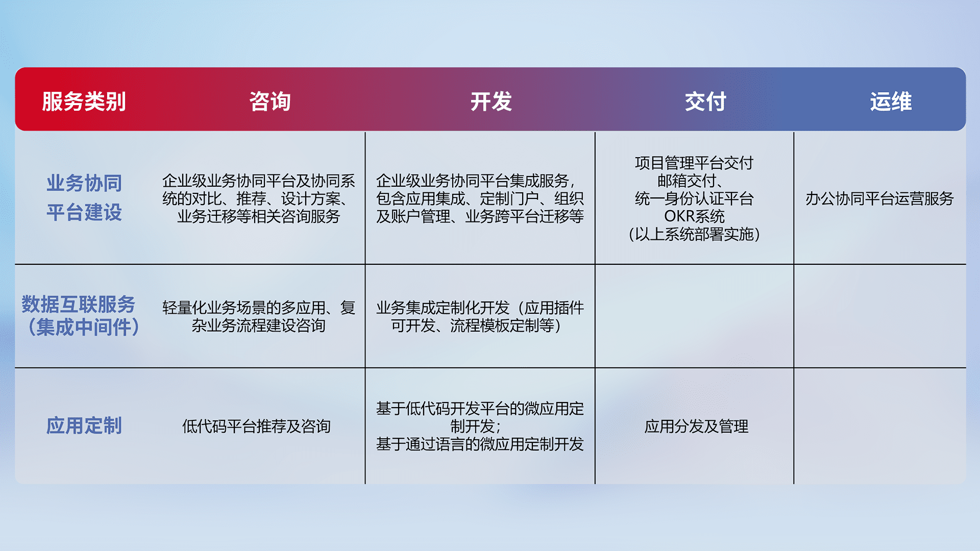 针对钉钉、、、、企微、、、、IDaas等平台级产品提供产品的规划、、、方案、、、交付、、、定制化开发等服务,,,实现如统一协同办公、、、、智能客户服务、、混合会议管理、、智能数据查询、、、等业务场景,,,,实现数字化转型。。。