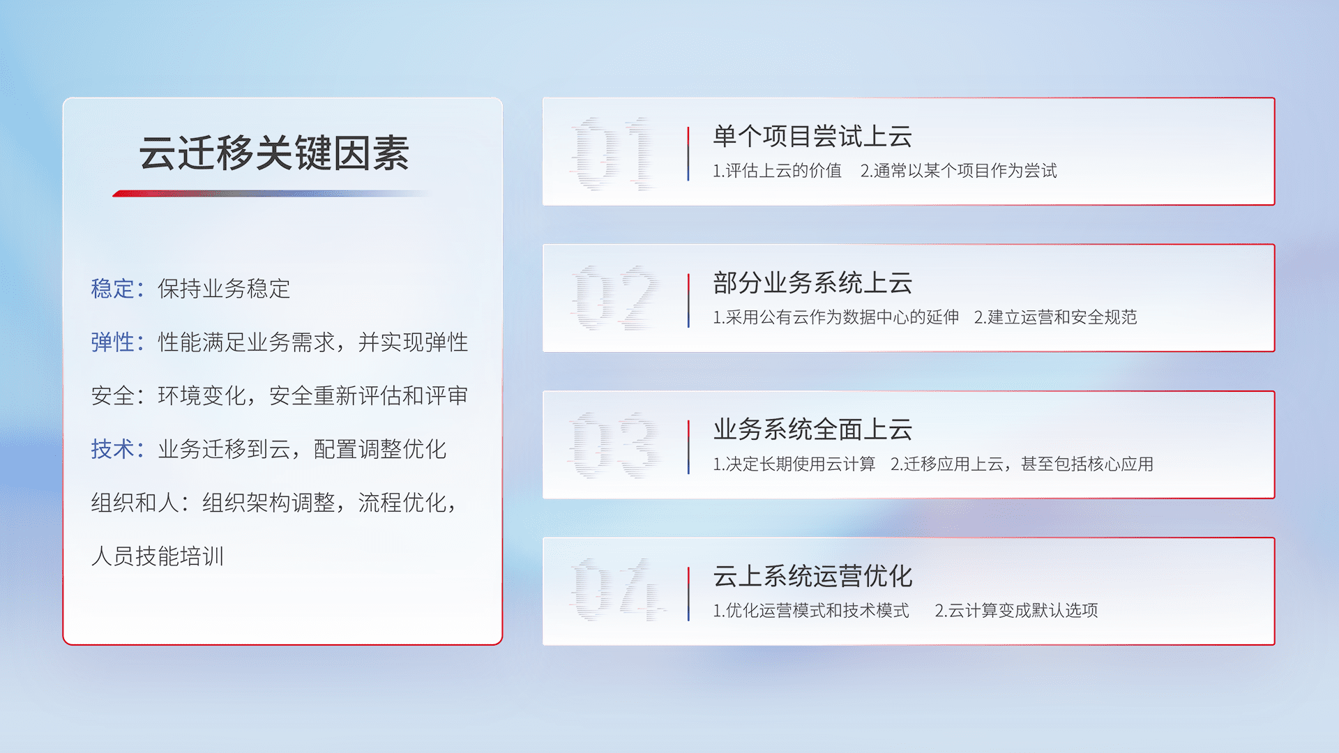 结合实际业务,,从规划设计、、、云平台选型、、云原生改造、、、数据迁移、、集成交付,,,,迁移全过程为客户识别最佳上云路径,,,做好风险识别管理,,,,设计网络架构、、、、身份权限、、、、安全审计合规、、操作审计、、、、日志审计、、、、监控告警策略、、、、多站点容灾设计等,,,对云上基础设施进行整体规划,,,,提升IT治理水平,,,以满足弹性、、、、高可用、、高性能的需求。。。
