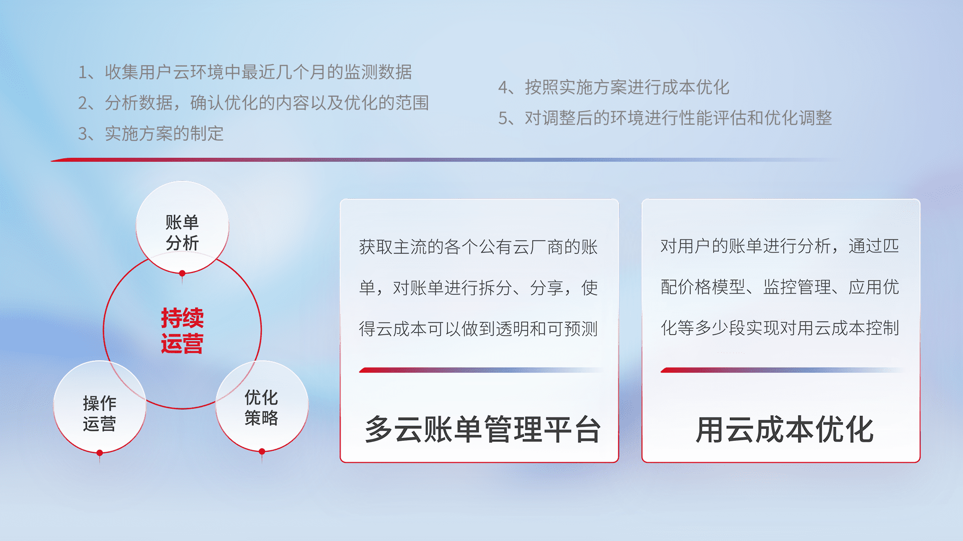通过多云纳管,,,,以统一的资源数据模型把客户的云资源进行抽象和封装,,进而实现对多云资源的统一操作,,,,保障云资源管理的可靠性、、、、稳定性与可用性。。。。量身定制化运维内容,,,配置、、、、开发运维、、补丁管理、、、备份、、监控、、、认证和访问管理、、审计和日常巡检等,,,,保障在用云过程中的可靠度,,,稳定度以及高可用率。。